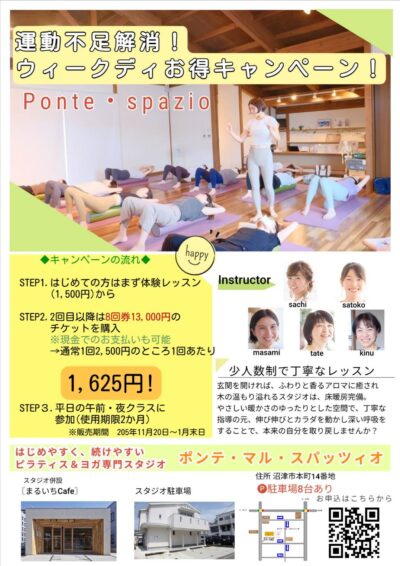 ポンテに来るのがはじめてな方も、いつも通って下さっているかたも、お久しぶりな方もどなたも対象となります^^デスクワークや家事で固まったカラダをほぐして、軽やかに動ける自分へ。是非この機会にピラティスもヨガも参加してみて下さいね^^